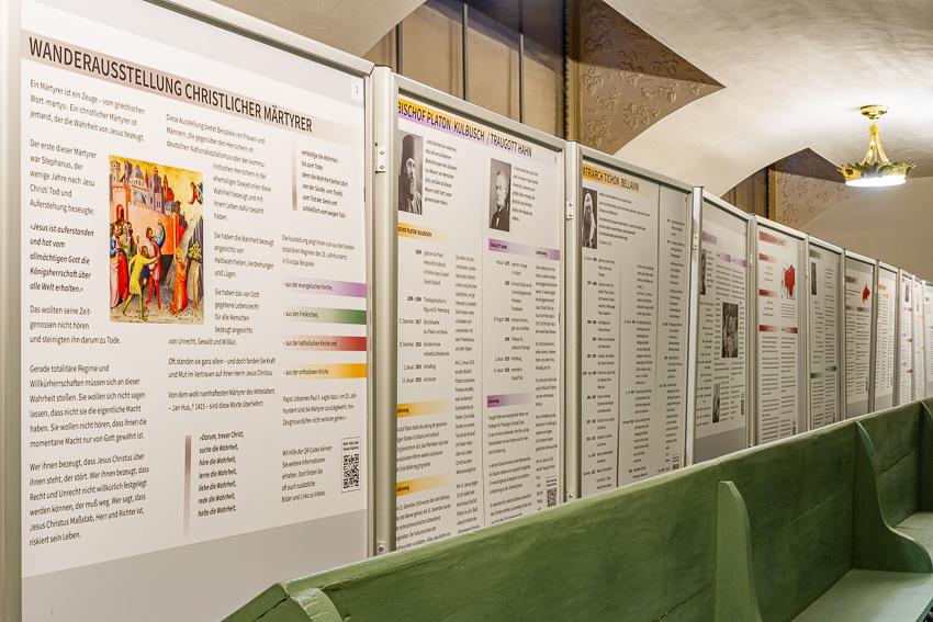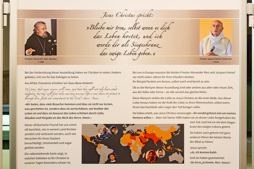 Die Wanderausstellung "Christliche Märtyrer" erinnert an Frauen und Männer, die in Europa insbesondere in der Hitler- und Stalinzeit ihr Leben für ihren Glauben und ihre Überzeugung gelassen haben. Bekannte Persönlichkeiten begegnen den Besucherinnen und Besuchern – wie z. B. Paul Schneider, der "Prediger von Buchenwald", ermordert 1939. Oder die Geschwister Scholl und Alexander Schmorell, Mitglieder der "Weise Rose", ermordet 1943. Viele sind darunter, die weniger bekannt sind, Christinnen und Christen aus evangelischen, freikirchlichen und freikirchlichen Gemeinden.