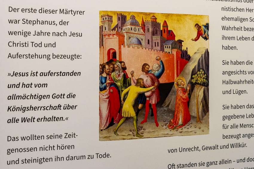 "Sie alle eint das gleiche Motiv", ist auf einer Ausstellungstafel zu lesen: "Diese Märtyrer stellen die Liebe zu Jesus Christus an die erste Stelle. Aus dieser Liebe heraus haben sie die Kraft der Liebe zu ihren Mitmenschen, selbst wenn ihnen das Nachteile oder sogar den Tod bringen sollte."