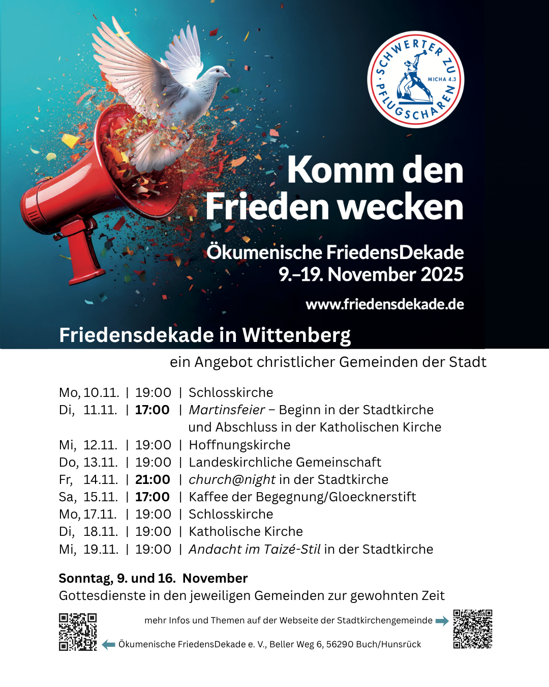 In Wittenberg begehen die christlichen Gemeinden die Friedensdekade mit Veranstaltungen an verschiedenen Orten. Eingebettet sind das Martinsfest, die church@night und der Buß- und Bettag.