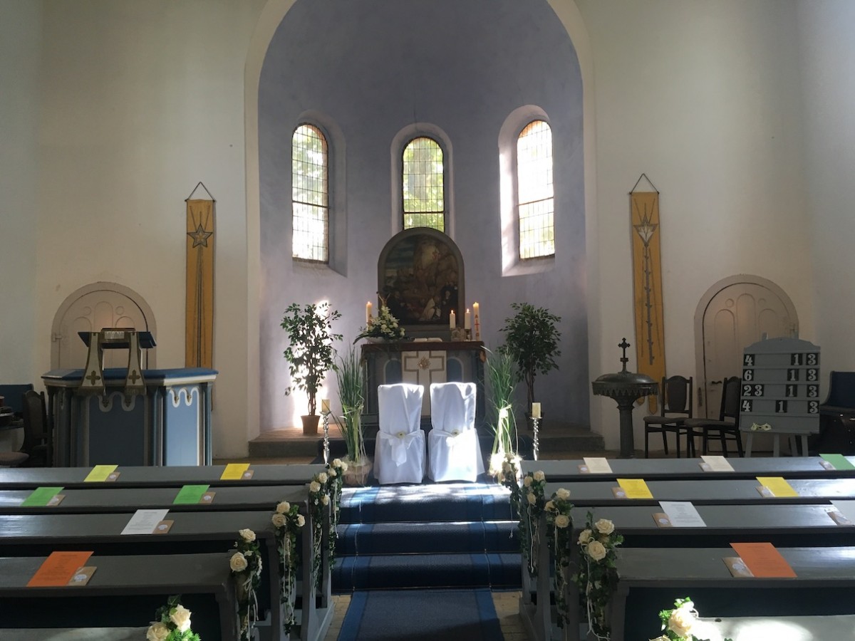 Ausstattung: Altar, Kanzel, Orgel, Taufstein, Glocke